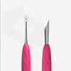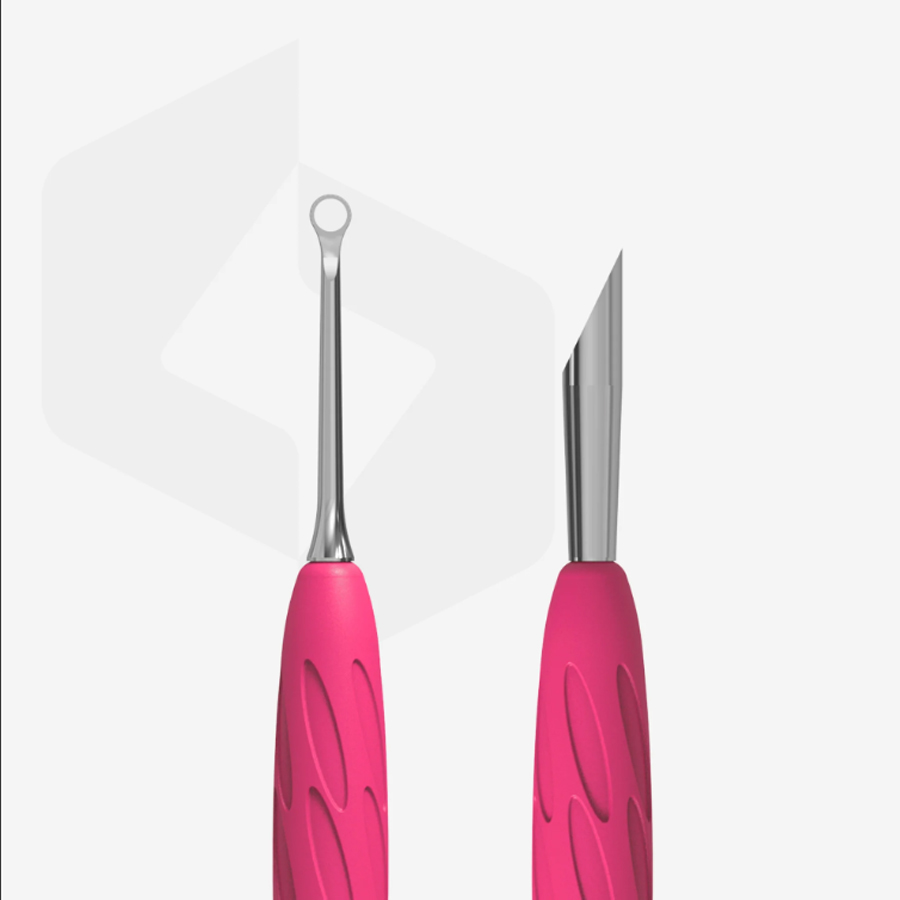 - La parte operativa "spintore obliquo" viene utilizzata per sollevare e spingere indietro le cuticole ruvide e fortemente aderenti, pulire il bordo libero dell'unghia;